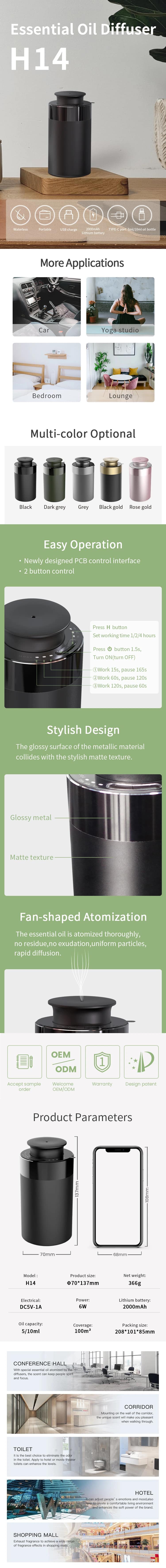 Crafted from premium, eco-friendly aluminum alloy, the H14’s sleek body is formed through a one-time molding process—an industry first in aroma diffuser manufacturing. Combining high-end aesthetics with practical innovation, it transforms any space into a serene, aromatic environment.