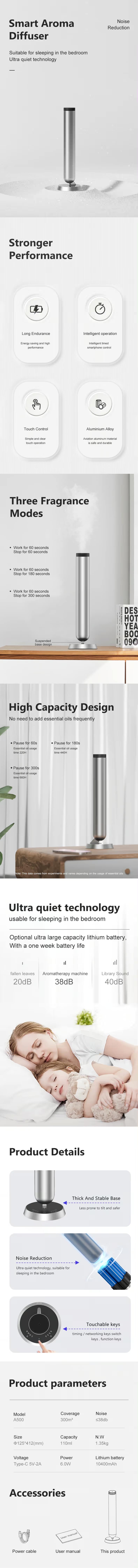 The Desktop Aroma Diffuser is crafted from high-grade aluminum alloy and features an innovative suspended design for a distinctive, modern aesthetic. Equipped with a 110 ml glass bottle, it delivers up to one month of continuous fragrance. Using patented micron-level atomization technology, it ensures even scent distribution and long-lasting aroma in spaces up to 300 m³.