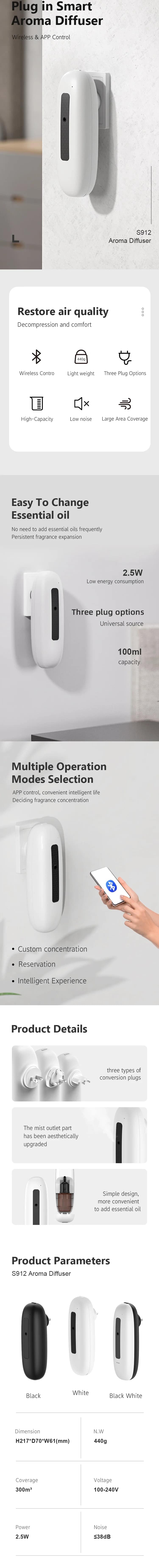 This aroma diffuser adopts intelligent Bluetooth APP control and an innovative design that can break through the large amount of fog. Focusing on the research and development of air vortex noise reduction technology, the actual noise is lower than similar products, and it has innovatively broken through the ultra-long fragrance performance. The air pump uses high-performance professional brushes to make the air pump life up to 1000 hours. The product is widely used in indoor spaces such as hotel, toilet, bar, airport and home. The integrated design of the body and plug can start the fragrance experience directly by plugging into the socket.